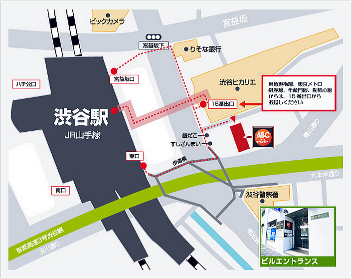 渋谷駅の東口を出ると、右手に歩道橋があります。歩道橋を上がってまっすぐ進み、つきあたりの左手の階段を降りると前方に「銀だこ」というたこ焼き屋さんがあります。「銀だこ」を右に曲がり、20mほど進むと1階に「B&D]というスポーツショップがあるビルです。。